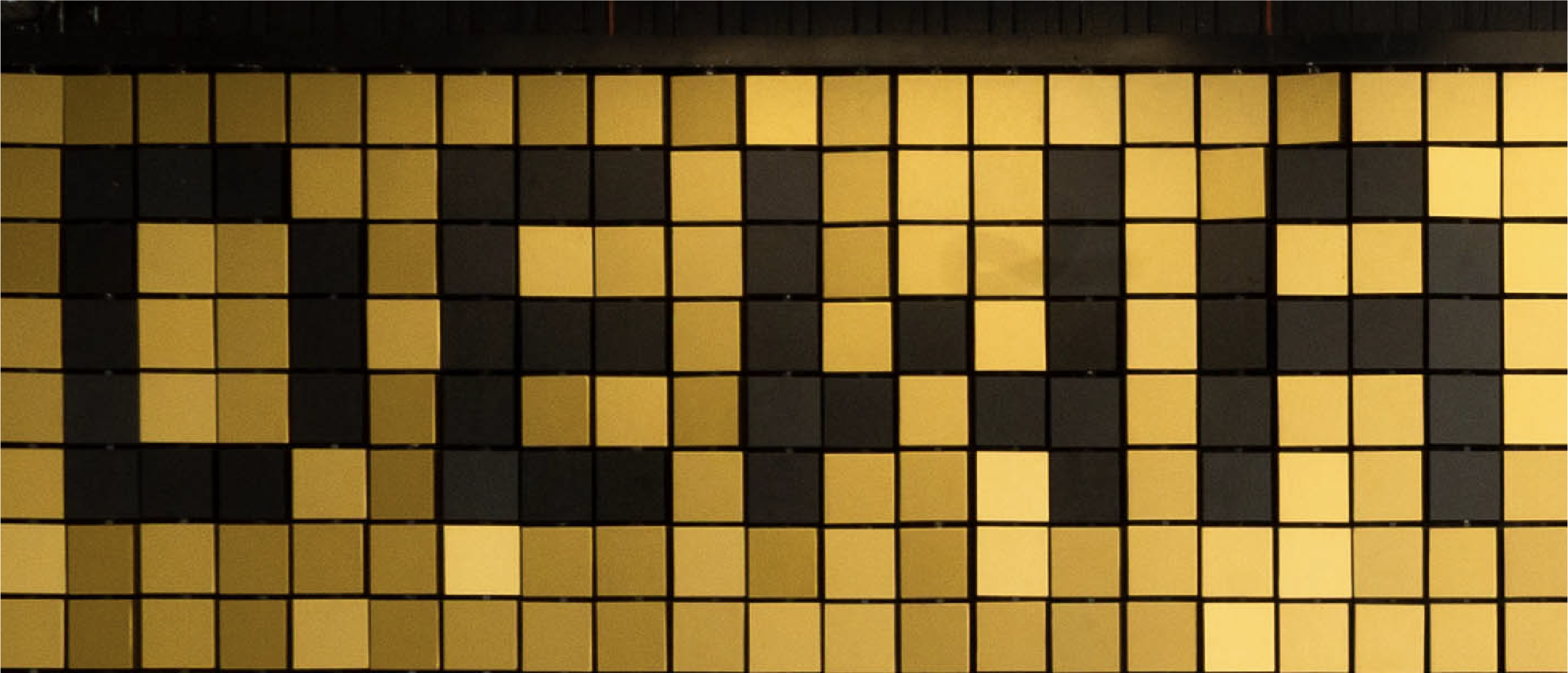 One of the compound’s unique highlights is the Rotating Grid Wall Panel. From ideation to drafting, Newman crafted this interactive wall from a grid of rotating squares. Each square can flip between two colors, allowing the wall to spell out words, display messages, or form bold patterns.