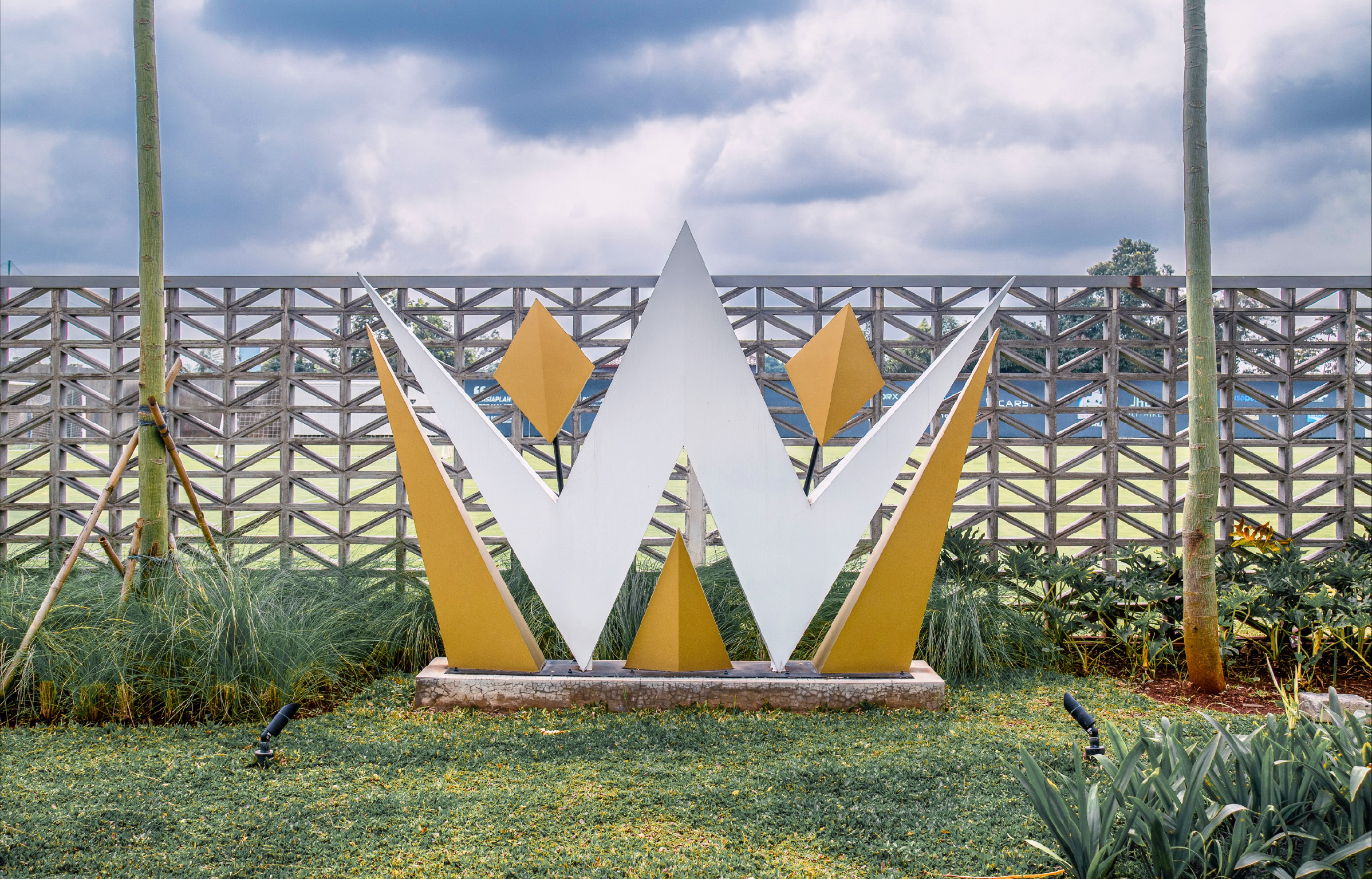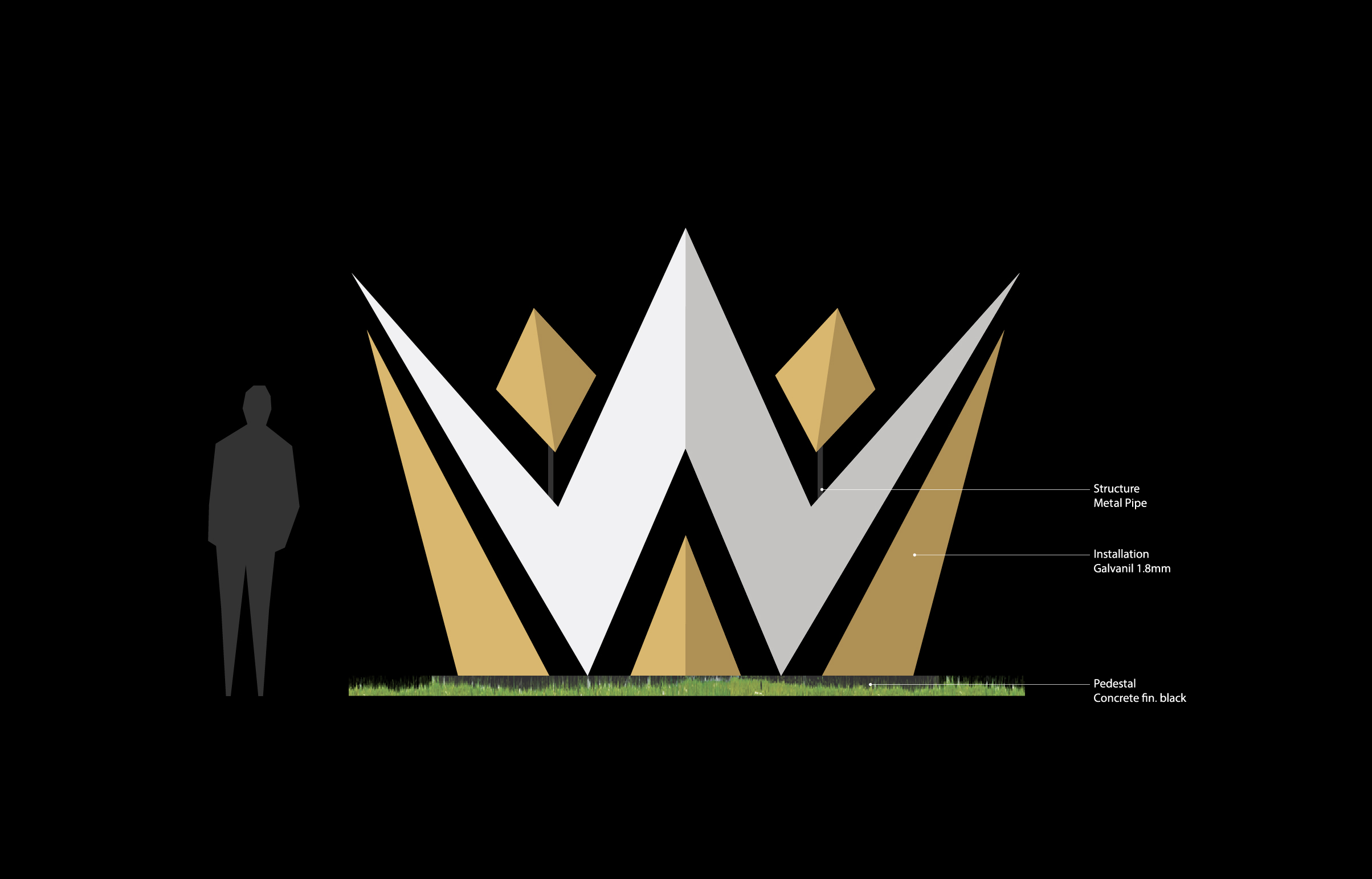 The main building façade features three monumental decorations that represent Dewa United’s divisions: football, basketball, and esports. Each piece is crafted from bent solid steel plates, with sharp edges to evoke dynamism and strength. Through a combination of negative space and perforated steel, these installations create a striking visual presence — at once modern, durable, and symbolic of the athletes’ pursuit of excellence.